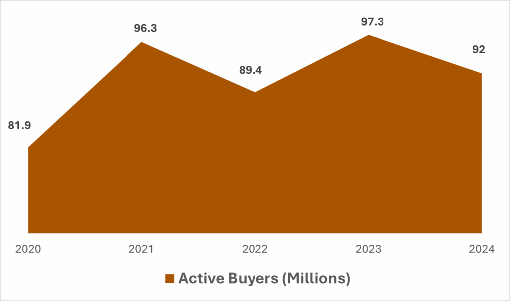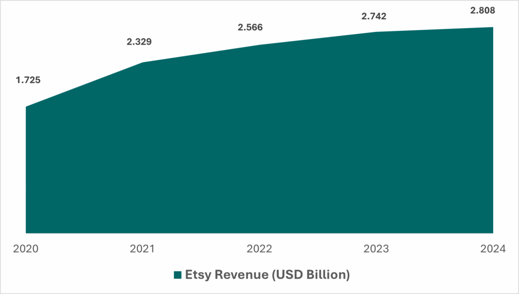 Etsy remains a top destination for digital-product sellers. Between 2020 and 2024, Etsy’s revenue grew steadily while active buyers fluctuated slightly due to seasonal peaks and marketplace dynamics